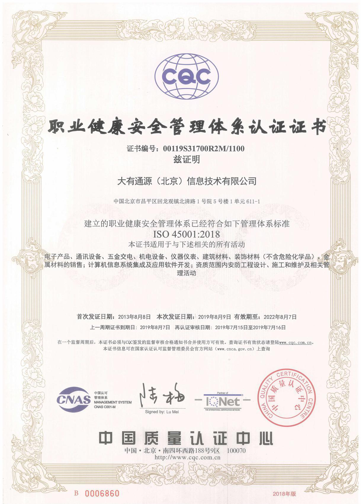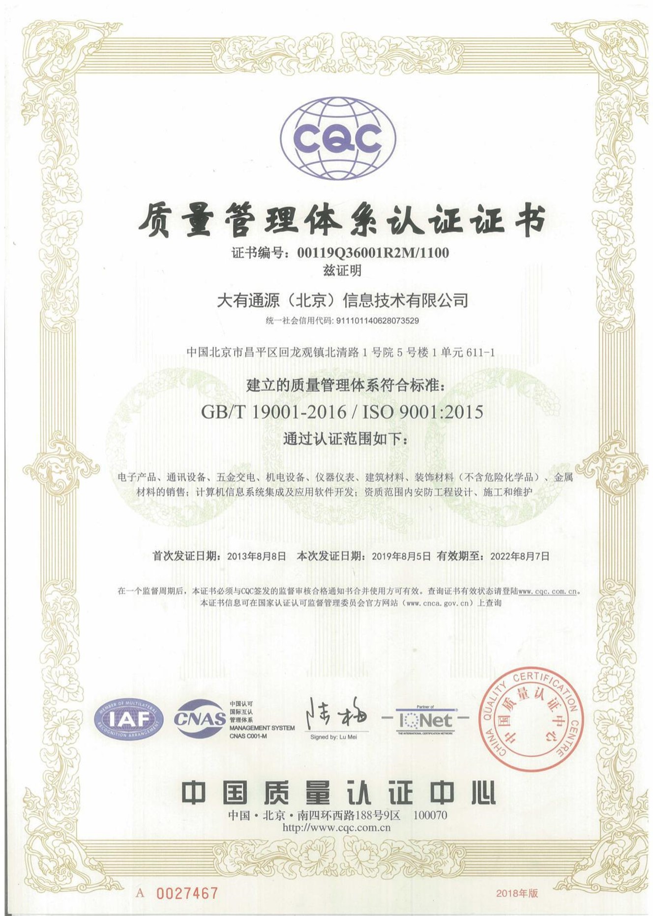 营业执照 质量管理体系认证证书