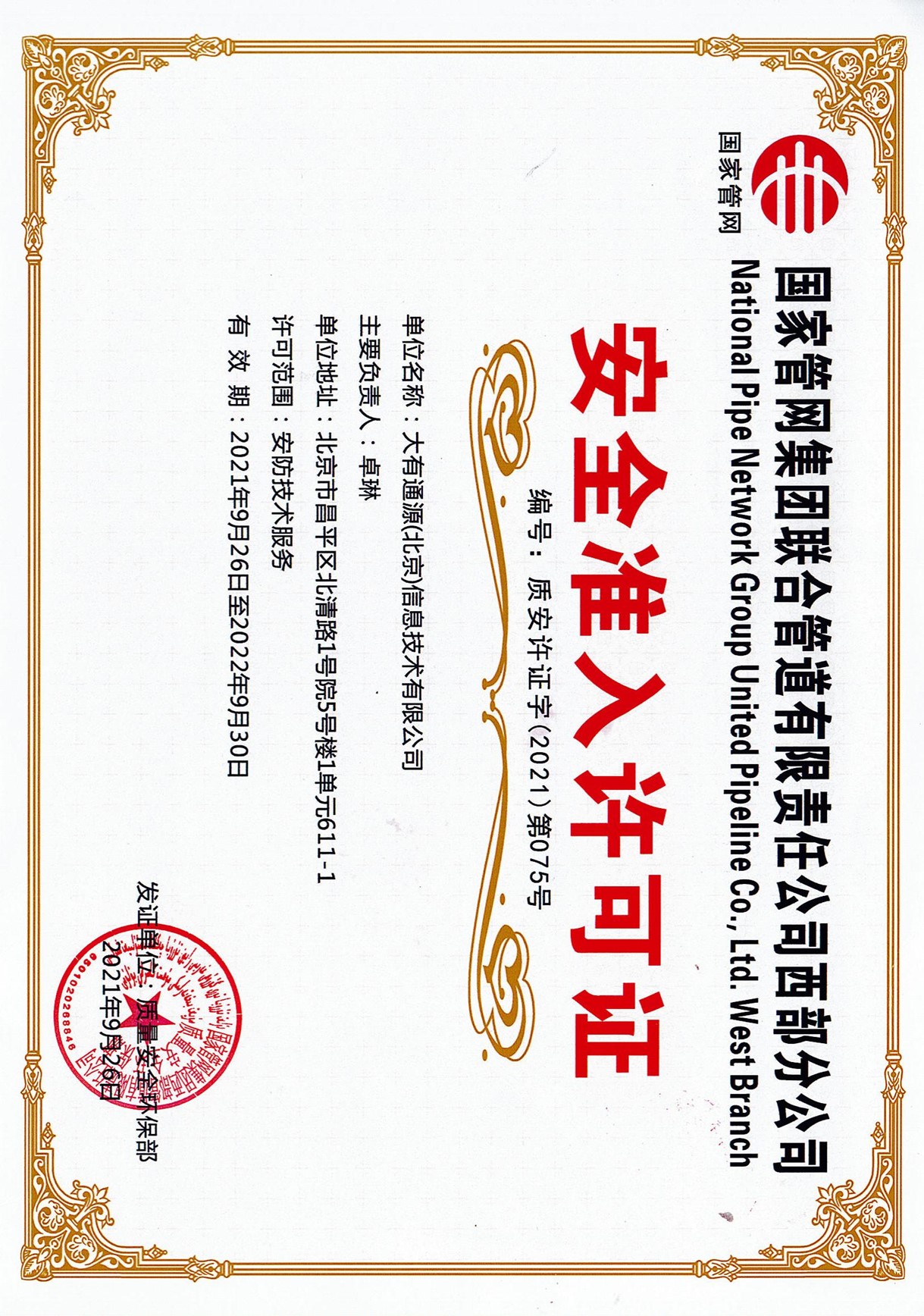 计算机软件著作权登记证书 安防工程企业设计施工维护能力叁级证书 中国石油天然气集团公司工程建设承包商准入证 中国石油西部管道分公司安全准入许可证 ![]()